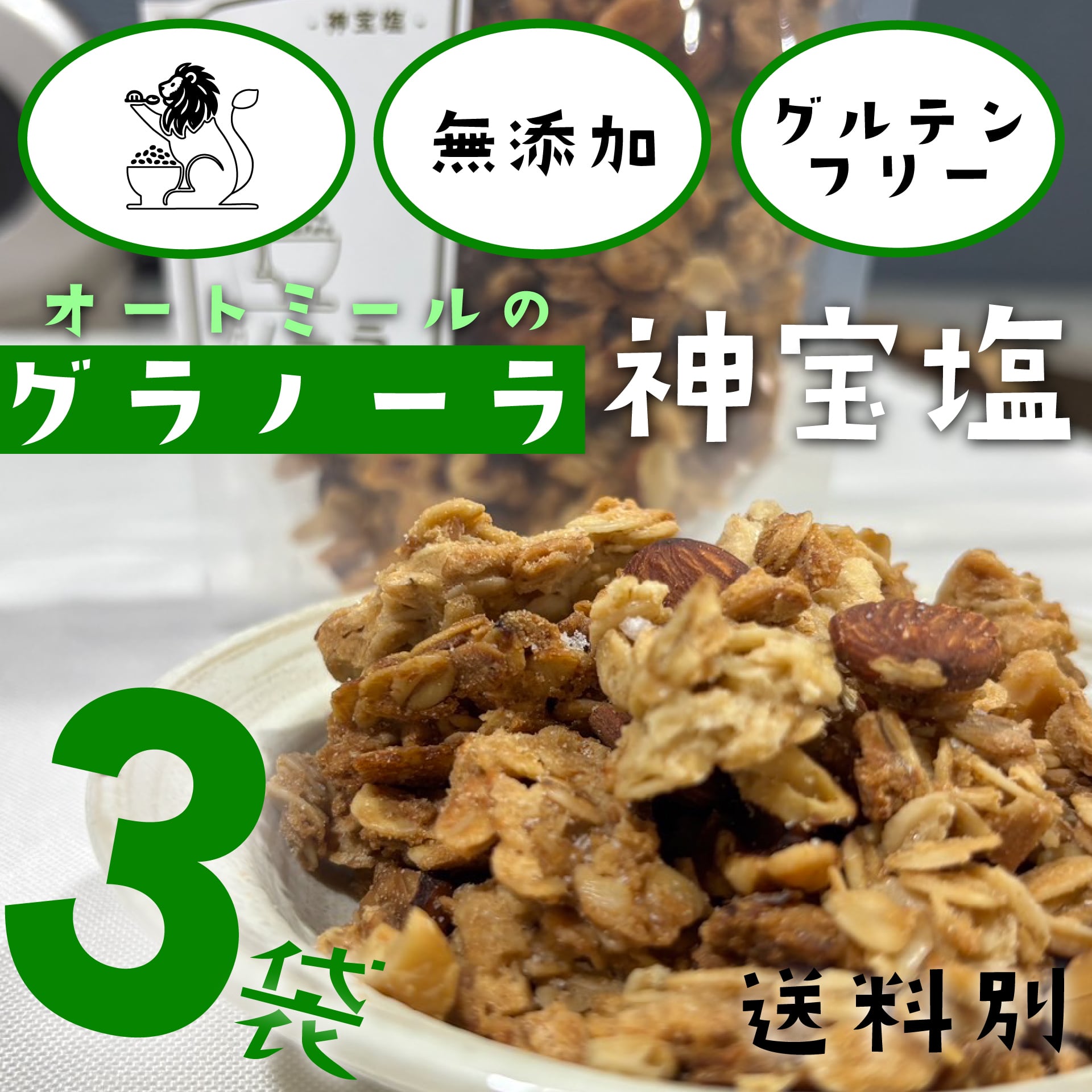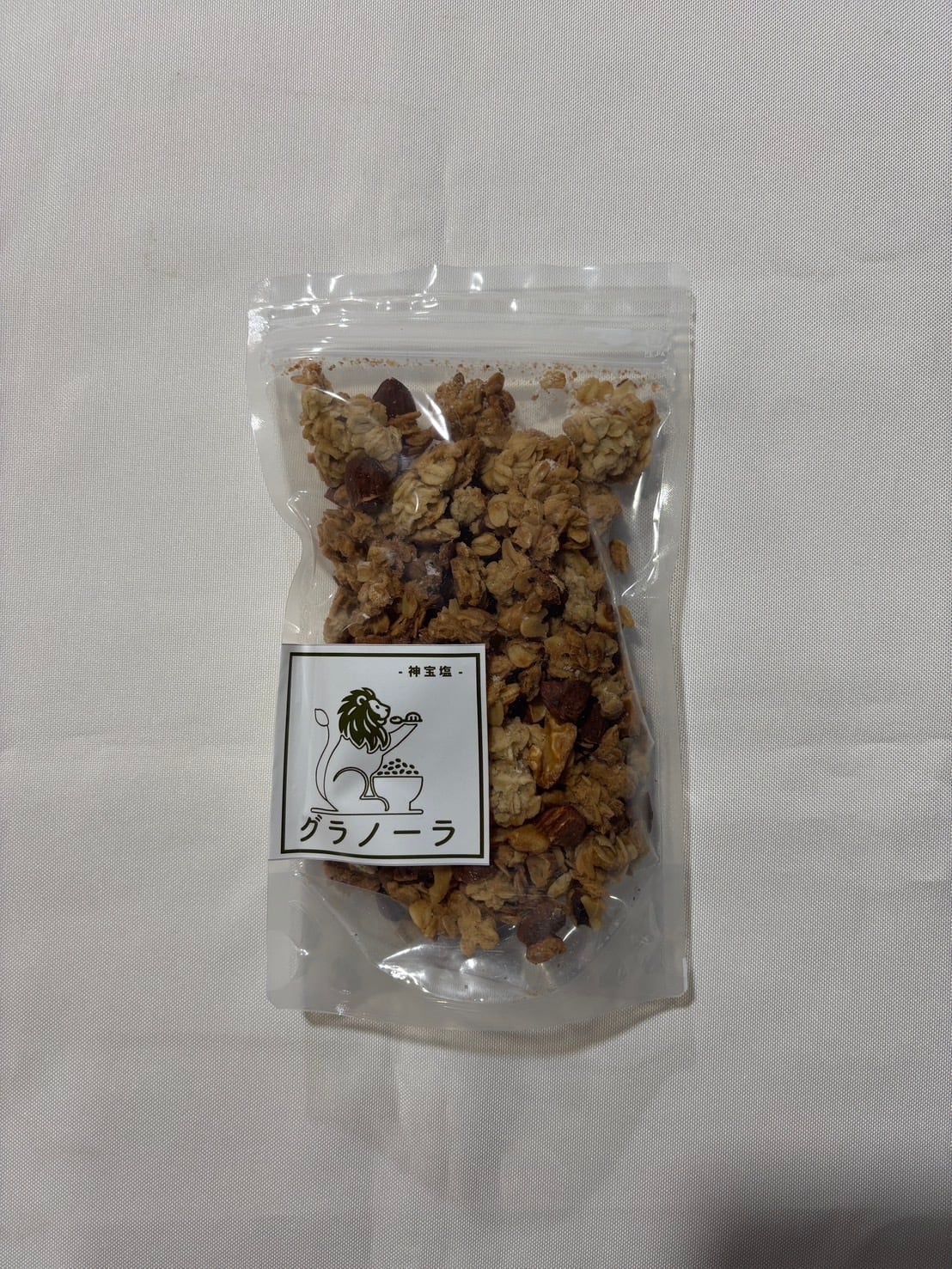 オートミール、米粉、胡桃、アーモンド、米油、神宝塩発酵パインシロップ、メイプルシロップ、神宝塩